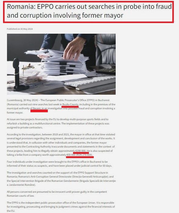 ***(Luxemburg, 30 mai 2024) – Parchetul European (EPPO) din București (România) a efectuat săptămâna trecută nouă percheziții în județul Buzău, inclusiv în sediul autorității municipale Beceni, în cadrul unei anchete privind posibile fraude și corupție implicând un fost primar.