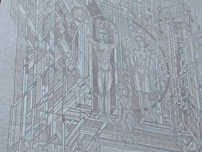 Lucrarea, pe care este scris şi un mesaj – Învăţământ, Cercetare, Producţie – ascunde un secret necunoscut la vremea respectivă de mai marii ţării şi judeţului. Mozaicul, care reprezintă sfânta familie, este inspirată din iconografie şi este o geometrie secretă a artiştilor. Autorităţile, la vremea montării lucrării în 1985, erau convinse că privesc un grup de muncitori, nicidecum o uriaşă icoană.