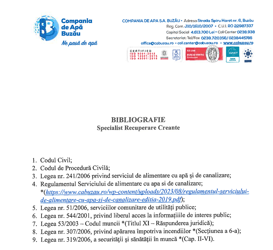 Bibliografia concursului poate fi consultată pe site-ul Companiei, la adresa- https://www.cabuzau.ro/despre-noi/cariere/specialist-recuperare-creante-departament-juridic/.