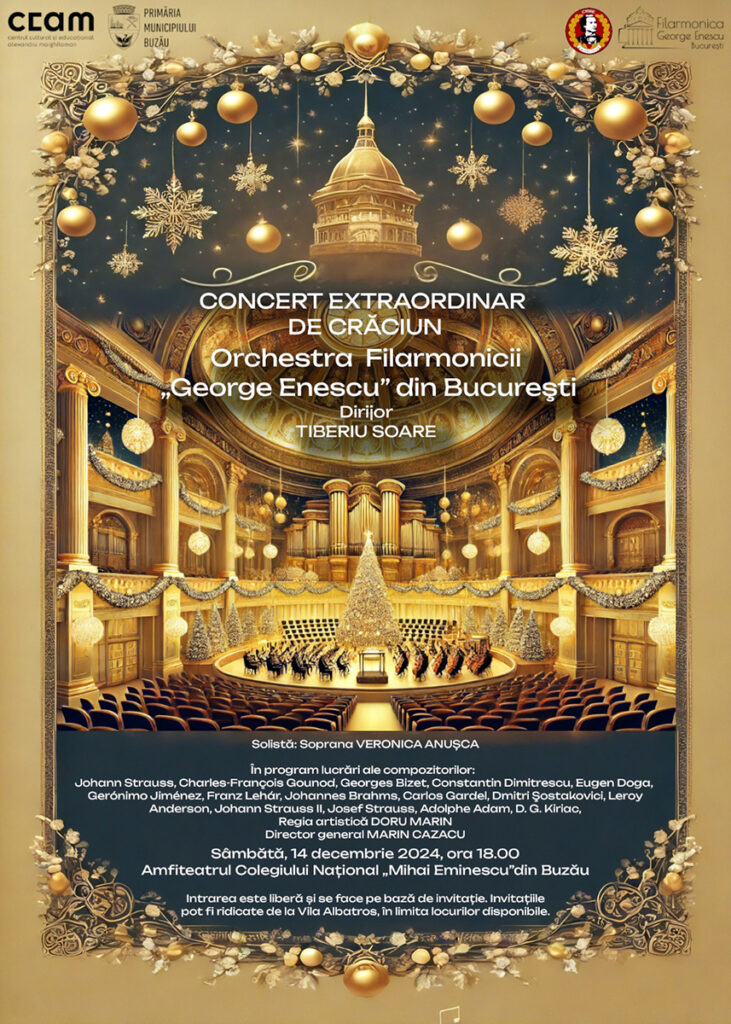 Primăria Municipiului Buzău și Centrul Cultural și Educațional „Alexandru Marghiloman” au deosebita plăcere de a invita publicul buzoian la Concertul Extraordinar de Crăciun, un eveniment de excepție care va avea loc sâmbătă, 14 decembrie 2024, începând cu ora 18:00, în Amfiteatrul Colegiului Național „Mihai Eminescu”.