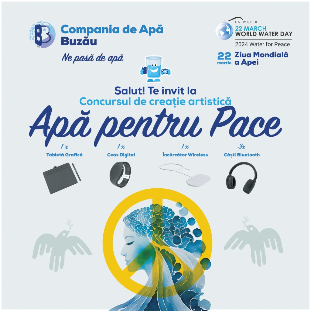 ”WATER FOR PEACE” este tema din acest an ce pune accentul pe importanța majoră a apei în lume, iar cu această ocazie Compania de Apă S.A. Buzău lansează Concursul de desen „Apa pentru Pace!” o temă sensibilă și provocatoare, precum acest lichid vital care stă la baza stabilității și prosperității lumii, și care, asemenea legăturilor dintre atomii săi, poate crea pace.