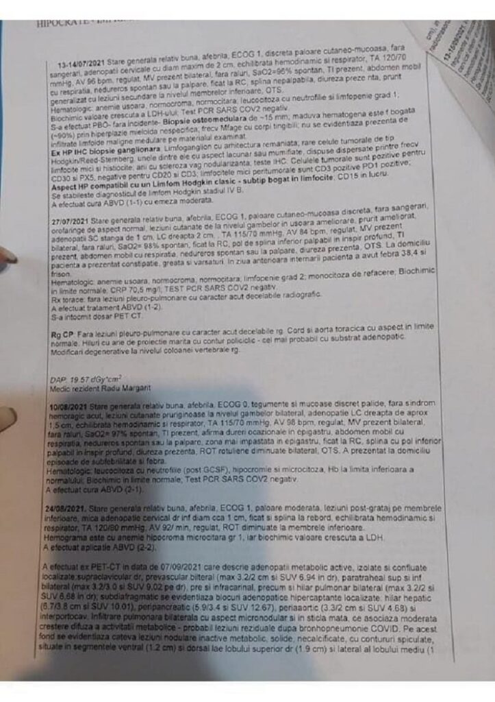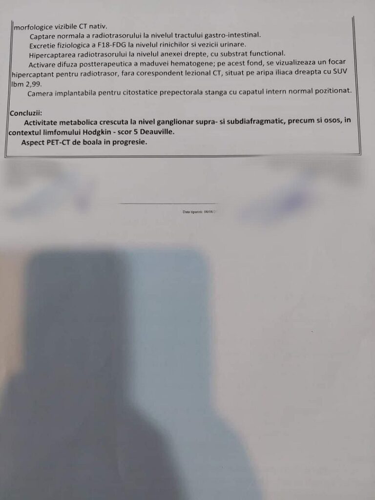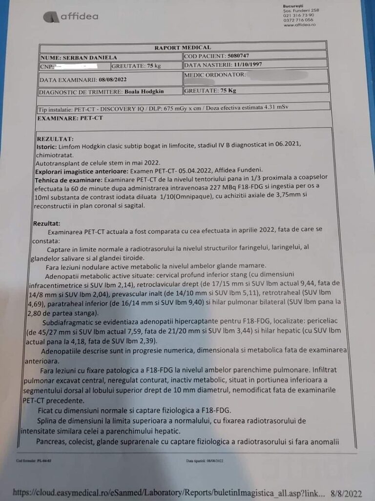În luna mai a acestui an, Daniela a făcut un transplant de celule stem, iar primele analize de după autotransplant i-au dat speranță, speranță ce a fost la scurt timp spulberată de rezultatele PET-CT-ului, care indica valori chiar mai crescute față de cele inițiale.