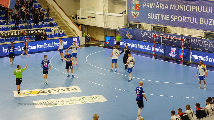 Meciul a fost echilibrat în prima repriză, niciuna dintre combatante nereușind să controleze ostilitățile. Buzoienii au condus în minutul 9 cu trei goluri, însă au fost rapid egalați, pe fondul unei stări de relaxare instituită prea devreme. Totuși, până la pauză, “Lupii” au revenit, reușind să se distanțeze din nou la trei lungimi față de adversar. La cabine, s-a intrat cu un 17-14 în favoarea gazdelor, aparent liniștitor pentru tabăra buzoiană.