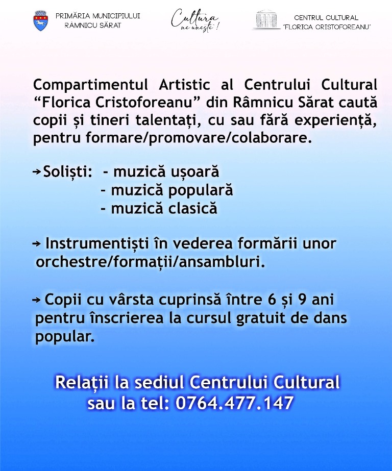 Centrul Cultural ,,Florica Cristoforeanu” din Râmnicu Sărat îi invită pe copiii și tinerii talentați să se alăture familiei instituției culturale, unde pot beneficia de formare și promovare, precum și de posibilitatea de a colabora cu centrul râmnicean. De asemenea, se dorește formarea unei orchestre/formații sau a unor ansambluri de instrumentiști.