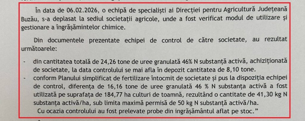 Tot în fața comisarilor de la Garda de Mediu, potrivit datelor oficiale prezentate de instituție, reprezentantul societății a menționat că a fertilizat solul pe parcele pe care sunt înființate culturi de grâu și orz, iar la Direcția Agricolă a menționat că a fost fertilizată o suprafață de 184 de hectare.