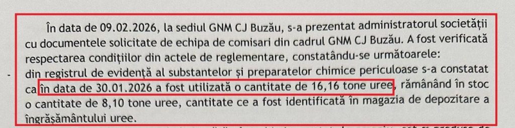 Garda de Mediu, singura instituție care a avut curajul să taxeze fermierul cu o amendă de 100.000 de lei (atât pentru fertilizarea efectuată, neconformă cu autorizația de mediu, cât și pentru nereguli privind depozitarea stocurilor de substanțe periculoase), a constatat, în urma verificării registrului de evidență a substanțelor și preparatelor chimice periculoase, că, în data de 30 ianuarie a fost utilizată o cantitate de 16,6 tone de uree granulată, rămânând în stoc o cantitate de 8,10 tone de uree (cântărită și confirmată de comisarii de mediu). Aceeași cantitate a fost constatată și de inspectorii de la Direcția Agricolă, în data de 6 februarie, când au fost în control la sediul firmei AGRA. Când a fost solicitat să dea explicații, fermierul respectiv a menționat la Garda de Mediu că, în perioada 30 – 31 ianuarie, a fertilizat solul cu uree granulată.