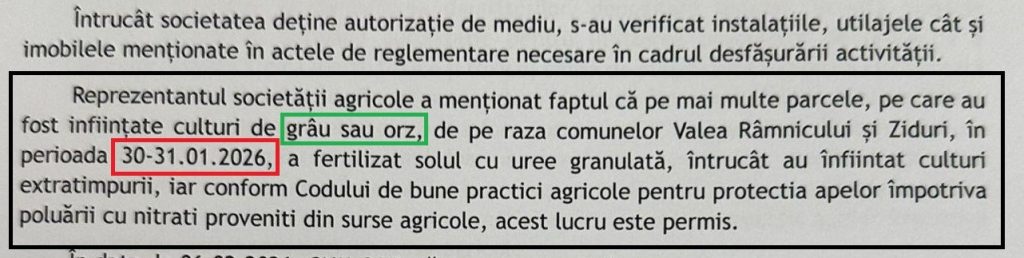 Fermierul de la Agra a justificat în fața echipelor de la Garda de Mediu și de la Direcția Agricolă că solul a fost fertilizat cu uree granulată deoarece au fost ,,înființate culturi timpurii, iar conform Codului de bune practice pentru protecția apelor împotriva poluării cu nitrați proveniți din surse agricole, acest lucru e permis”. Numai că permisiunea este valabilă în cazul culturilor pentru care data semănatului este în perioada de interdicţie (la noi, 15 noiembrie – 10 martie). Specialiștii în agricultură consultați de reporterii Campus TV și care au vizionat imaginile cu acele culturi de grâu și rapiță au fost unanimi în analiză, spunând că au fost semănate în perioada optimă, nu în afara perioadei de interdicție. De altfel, și directorul Direcției Agricole a admis acest lucru.