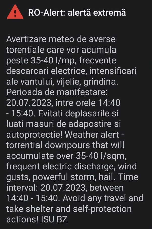 La scurt timp după ce ploaia torențială s-a abătut asupra orașului, ISU a transmis un mesaj RO-Alert de vreme severă, prin care avertiza populația de producerea unor fenomene extreme, sfătuind-o să evite deplasările și să ia măsuri de adăposturi, unde este cazul.