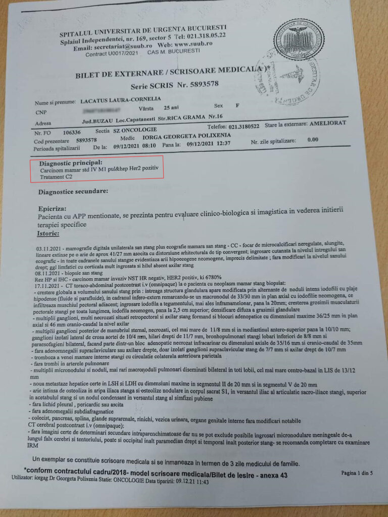 Laura a fost diagnosticată anul trecut cu Carcinom mamar std. IV M1, a urmat chimioterapie și radioterapie la un spital din București, dar printr-o minune s-a deschis o portiță către un spital din Turcia, prin intermediul unui om cu suflet mare. Cazul Laurei a fost acceptat, urmând ca pe 8 februarie 2023 să plece în Turcia unde i se vor face multe investigații, pentru început o cură de tratament care implică costuri prea mari pentru familia Laurei.