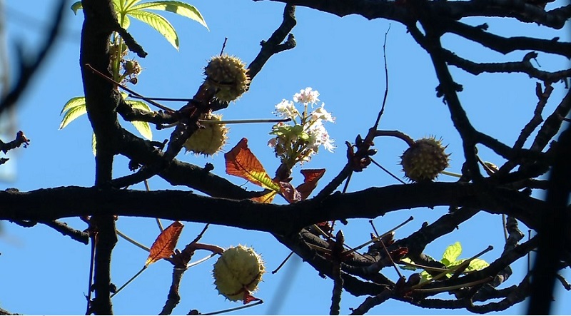 Pentru mulți e de necrezut că aproape de jumătatea lunii octombrie, mai multe flori în formă de lumânare sau de clopot, de nuanţe albe cu roz deschis, şi-au făcut apariţia în castanii sălbatici. Este pentru a doua oară când castanii au flori, în acest an, alături de fructe uscate care stau să cadă şi frunzele ruginii.
