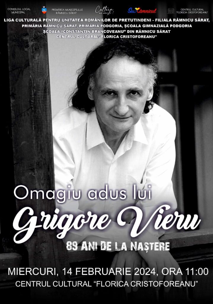 La 89 de ani de la nașterea poetului Grigore Vieru, Primăria Râmnicu Sărat, Primăria Podgoria, Școala Gimnazială Podgoria, Școala ,,Constantin Brâncoveanu” din Râmnicu Sărat, Centrul Cultural Florica Cristoforeanu, în parteneriat cu Liga Culturală pentru Unitatea Românilor de Pretutindeni organizează un eveniment omagial.