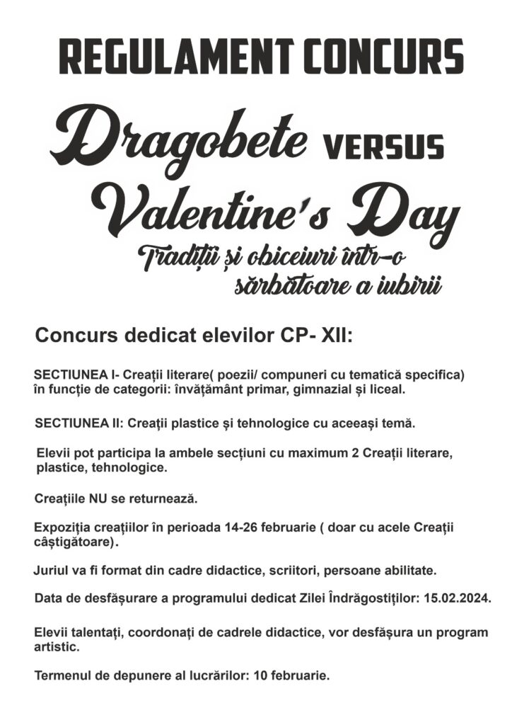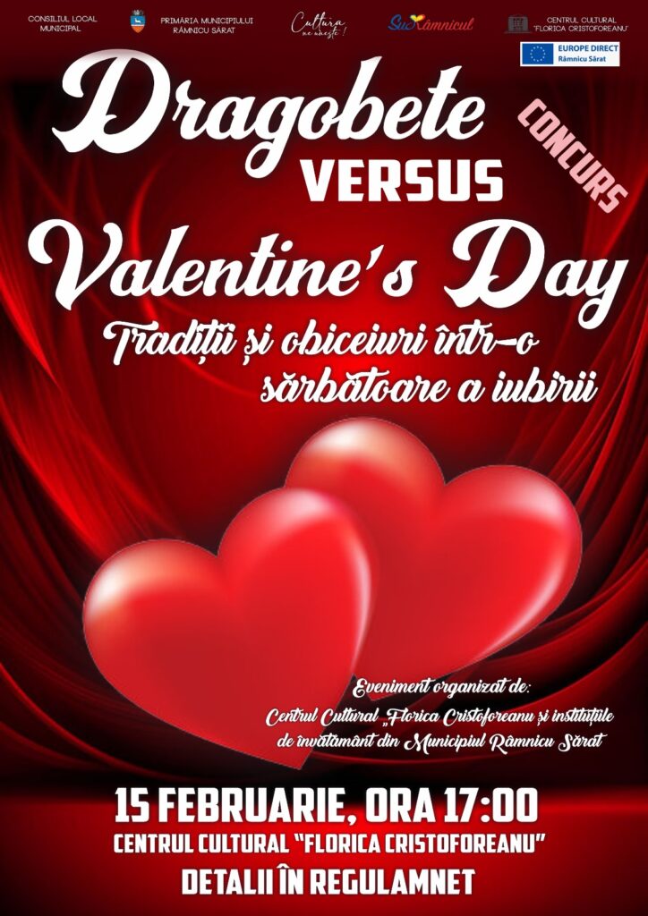 Centrul Cultural ,,Florica Cristoforeanu” din Râmnicu Sărat, în parteneriat cu unitățile de învățământ din municipiu, organizează concursul ,,Dragobete versus Valentine’s Day”, prin care elevii sunt provocați să participe prin creații literare și plastice despre tradiții și obiceiuri legate de cele două sărbători.
