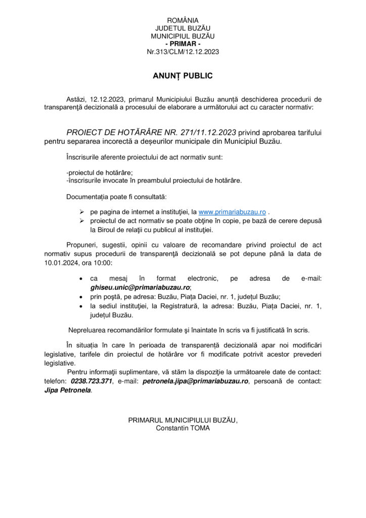Primăria Buzău, anunț public privind aprobarea tarifului pentru separarea incorectă a deșeurilor municipale