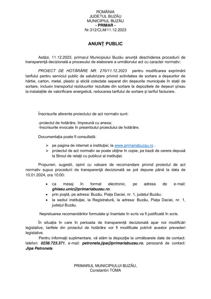 Primăria Buzău, anunț public privind modificarea exprimării tarifului pentru serviciul public de salubrizare privind activitatea de sortare