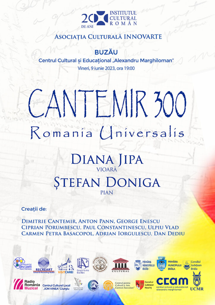 Vineri, 9 iunie 2023, violonista Diana Jipa și pianistul Ștefan Doniga vor susține la Centrul Cultural și Educațional „Alexandru Marghiloman” din Buzău, începând cu ora 19:00 un recital cameral dedicat sărbătoririi personalității lui Dimitrie Cantemir, la 350 de ani de la naștere și 300 de ani de la trecerea în neființă.