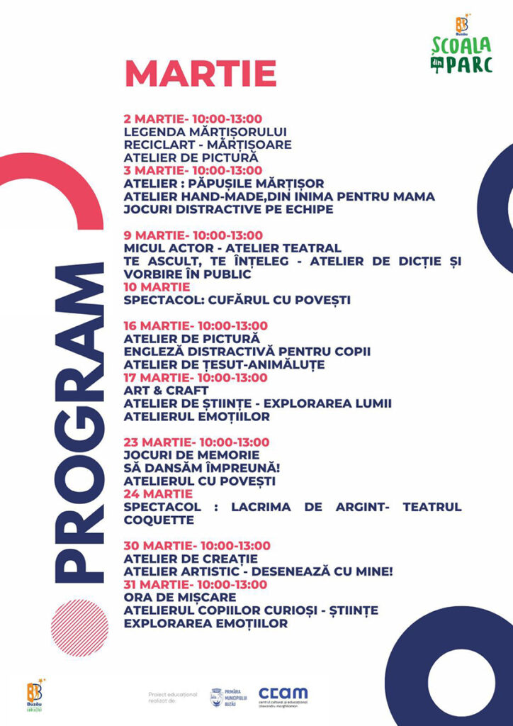 Primăria Municipiului Buzău și Centrul Cultural și Educațional „Alexandru Marghiloman”, anunță programul lunii MARTIE din cadrul proiectului Școala din parc Buzău. Proiectul Școala din parc Buzău este un angajament continuu pentru promovarea educației și culturii în comunitatea noastră și are ca scop educarea publicului tânăr și facilitarea accesului gratuit la educația non-formlă și cultură.
