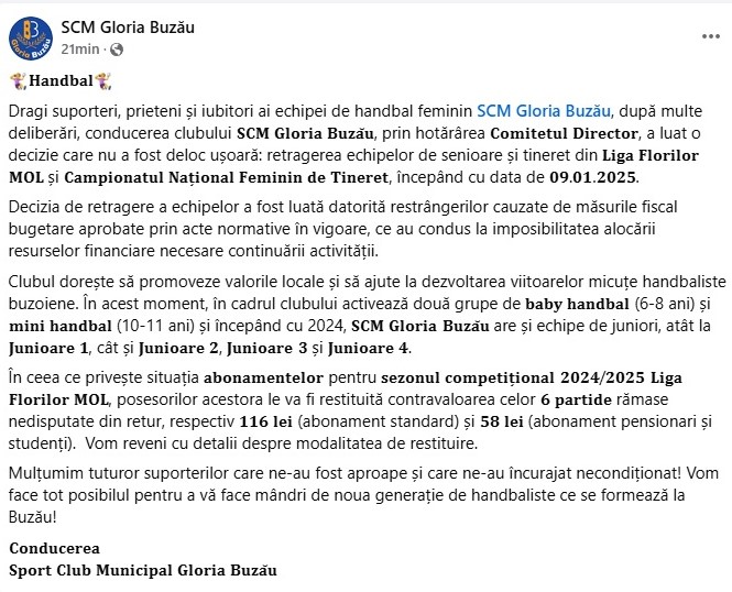 ,,Dragi suporteri, prieteni și iubitori ai echipei de handbal feminin SCM Gloria Buzău, după multe deliberări, conducerea clubului SCM Gloria Buzău, prin hotărârea Comitetul Director, a luat o decizie care nu a fost deloc ușoară: retragerea echipelor de senioare și tineret din Liga Florilor MOL și Campionatul Național Feminin de Tineret, începând cu data de 09.01.2025.