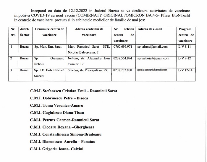 În județul Buzău, sunt amenajate patru centre de vaccinare, iar în unele localități, noul ser al celor de la Pfizer poate fi administrat și de medicul de familie, pe bază de programare.