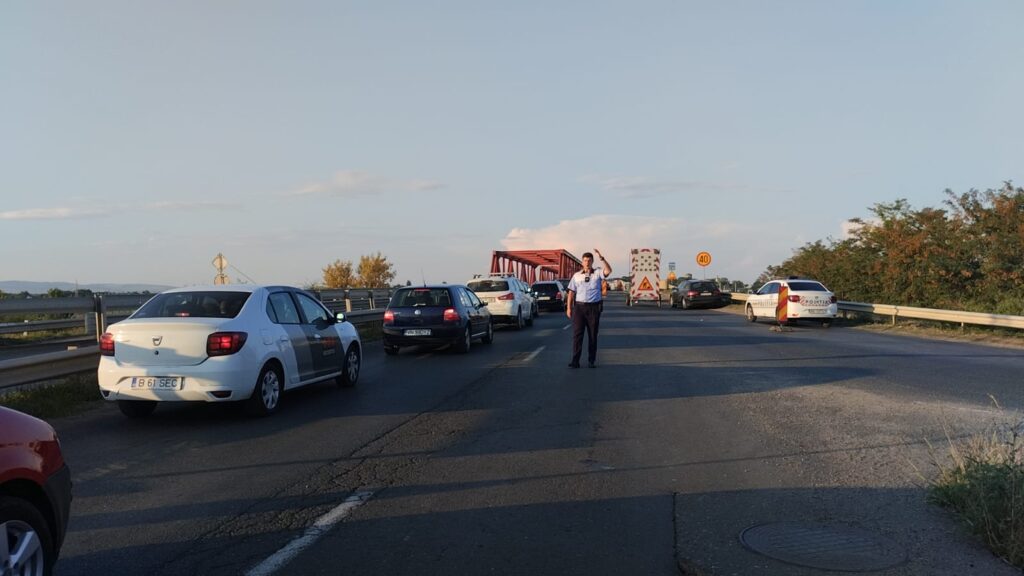 Spre seară, lângă podul unde încă se efectuau lucrări, circulația era dirijată de un echipaj de la Serviciul Rutier.
