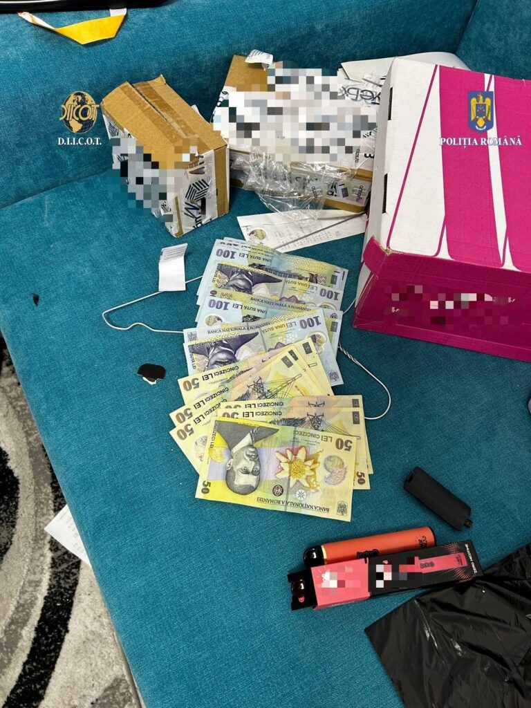 Au fost puse în aplicare șase mandate de percheziție domiciliară pe raza județelor Vrancea, Buzău și Brăila fiind identificate și ridicate cantitatea de 20 de grame de cocaină, sumele de 10.300 euro și 1.200 lei, un cântar electronic de precizie, mai multe obiecte ce prezentau urme de substanțe susceptibile a fi droguri, dispozitive artizanale pentru prizat și porționat droguri, ambalaje folosite pentru distribuirea drogurilor, precum și 3 telefoane mobile.